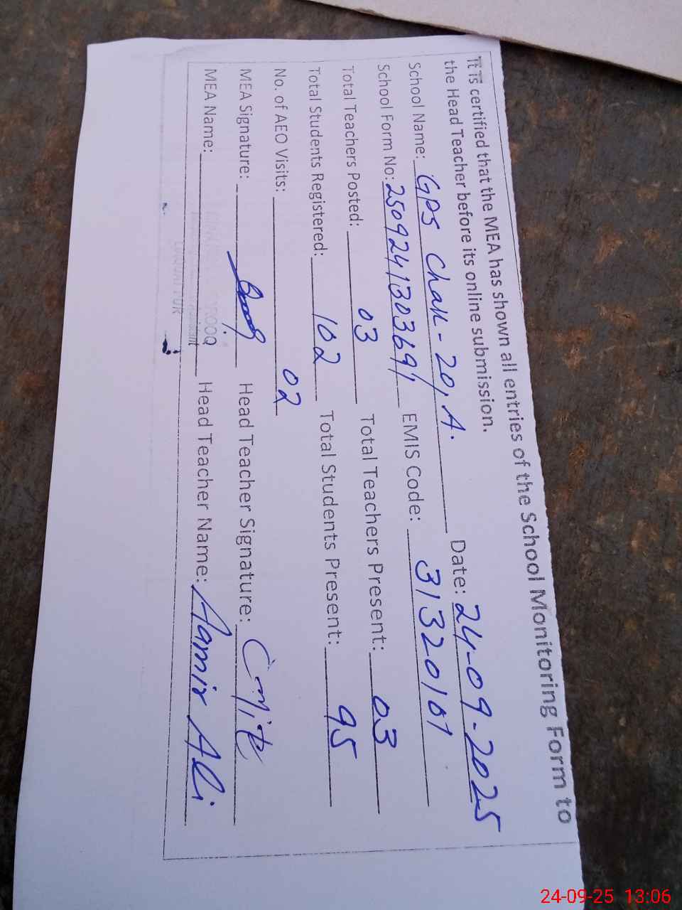 | EMIS Code: 31320101 | Name of School: GPS CHAK 20/A | |||