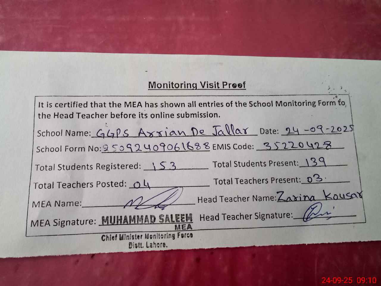 | Attendance Register | Head Teacher | MEA with School | Visit Proof |