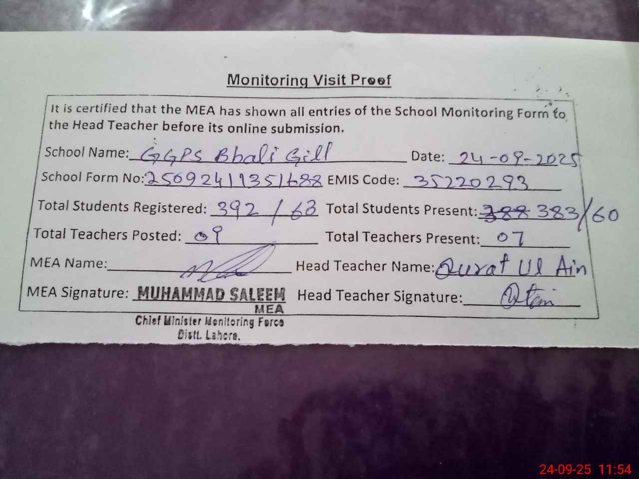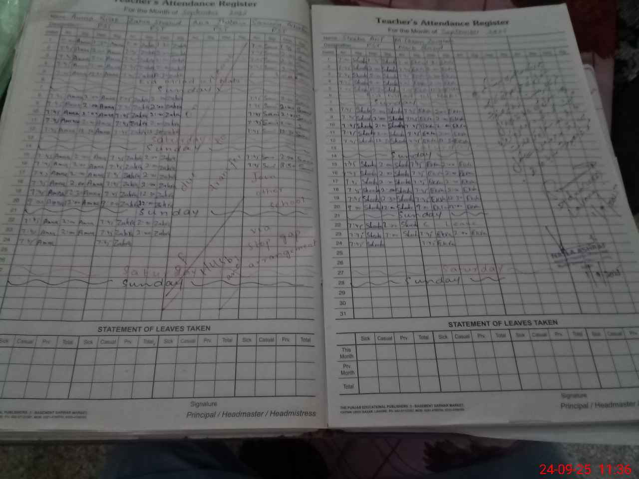 | Remarks (Use Separate Page if Required): PST teacher Asia Shaban is on one month leave her leave approval found upto Dy DEO but not found her leave approval on SIS so marked her absent as per SOP One more class room and three teachers are required as mentioned by head teacher 35220293 | |||||