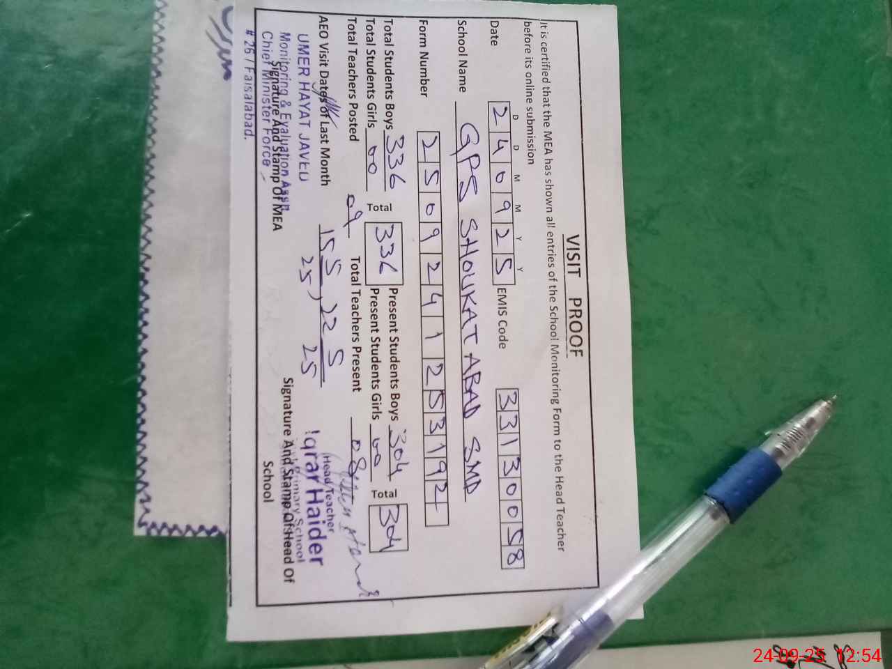| Name: IQ**** HA**** KA**** Designation: (School Headmaster's/Headmistress's) PST Phone/Cell Number: 03**** |