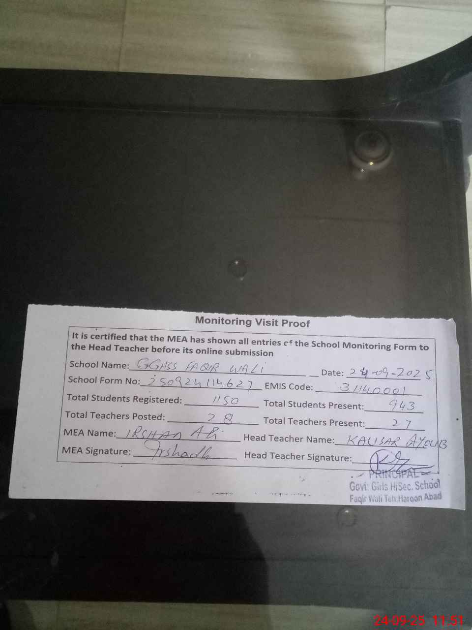 | Attendance Register | Head Teacher | MEA with School | Visit Proof |