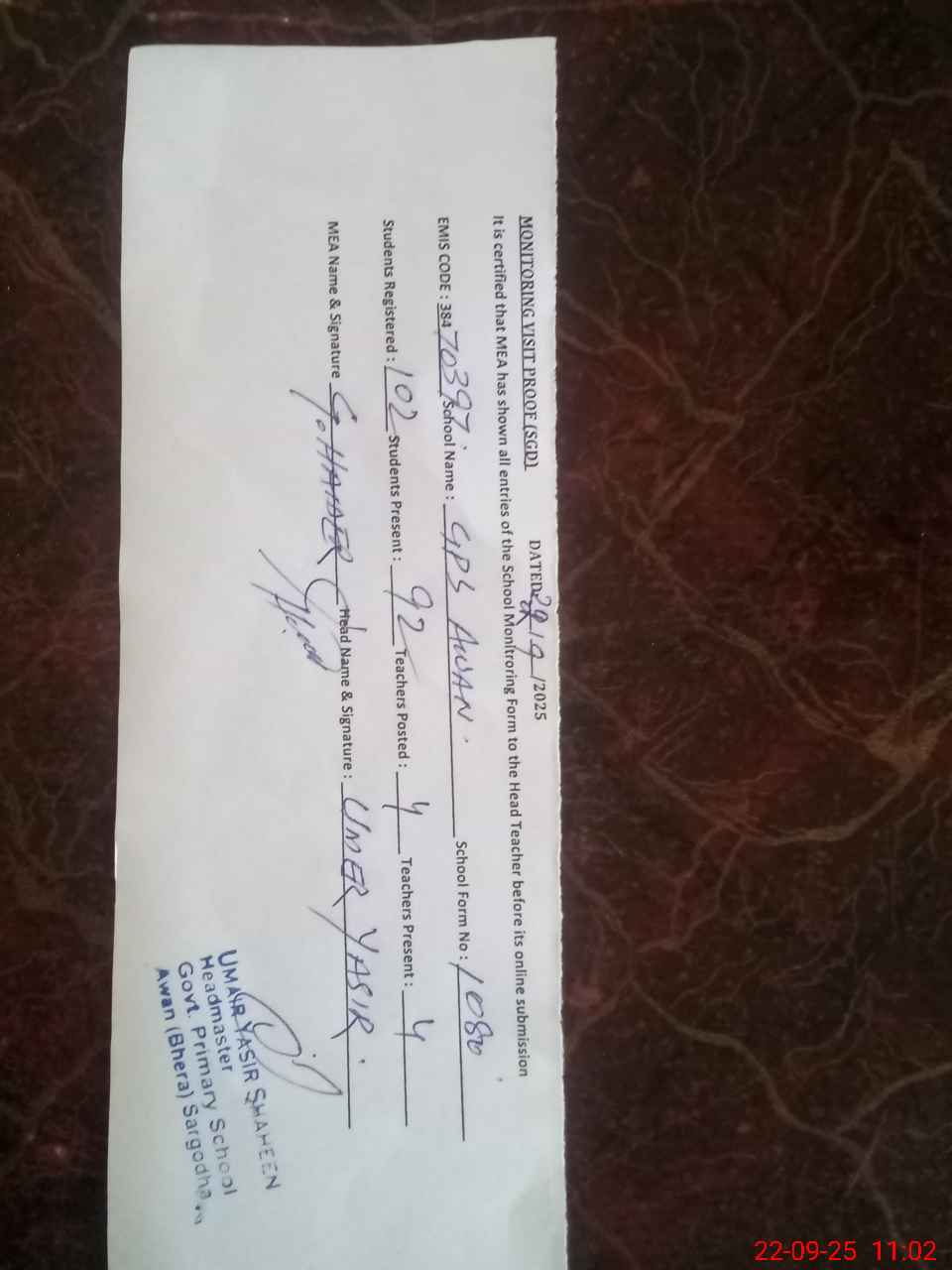 | Attendance Register | Head Teacher | MEA with School | Visit Proof |