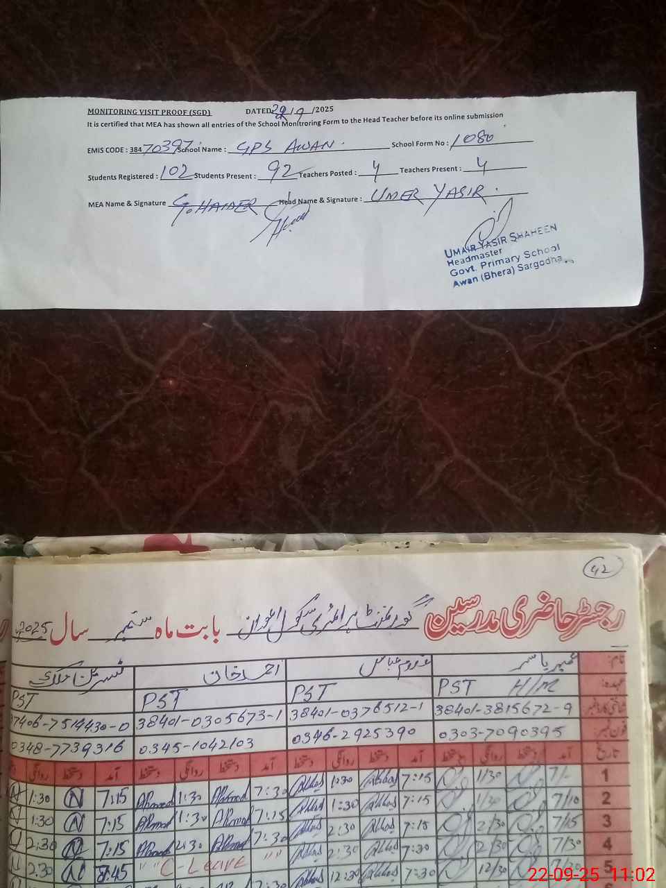 | Name: Um**** Ya**** Designation: (School Headmaster's/Headmistress's) PST Phone/Cell Number: 03**** |