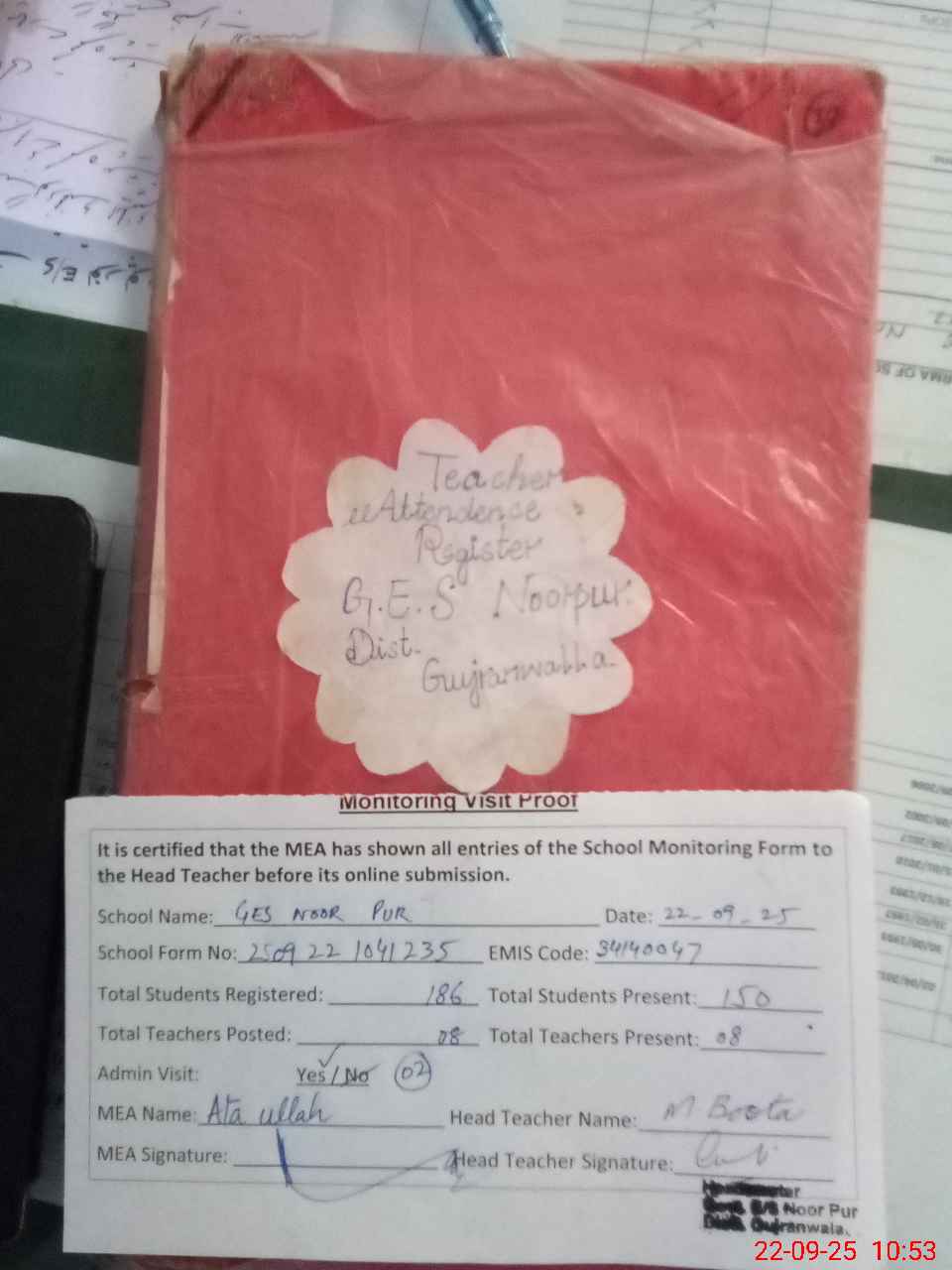 | Attendance Register | Head Teacher | MEA with School | Visit Proof |