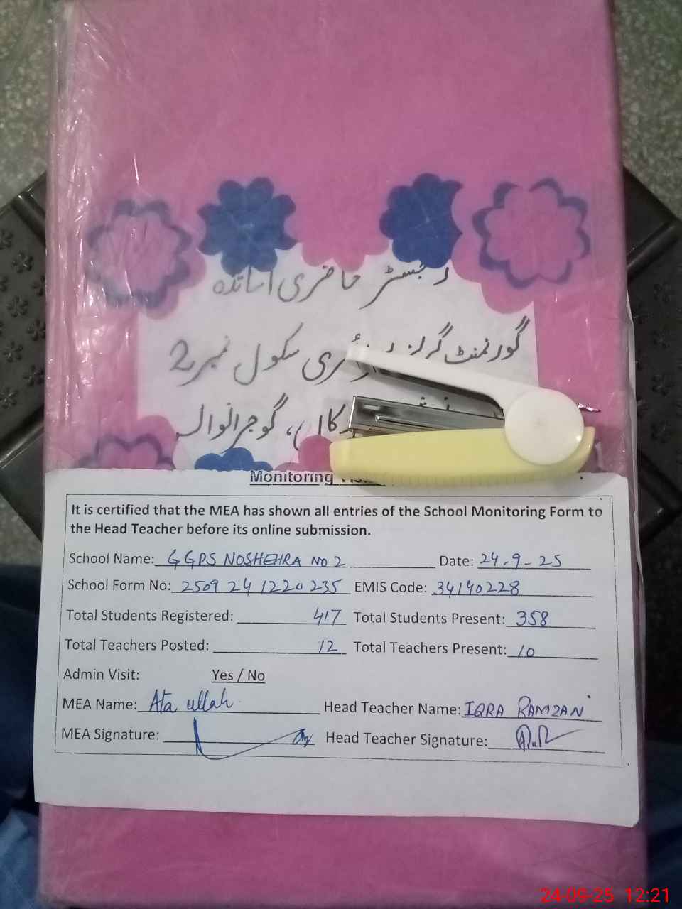 | Attendance Register | Head Teacher | MEA with School | Visit Proof |