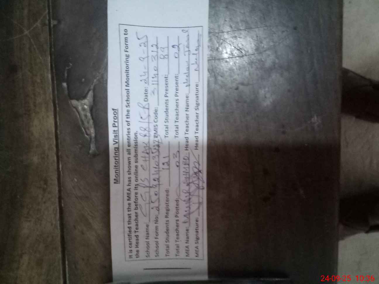 | Attendance Register | Head Teacher | MEA with School | Visit Proof |
