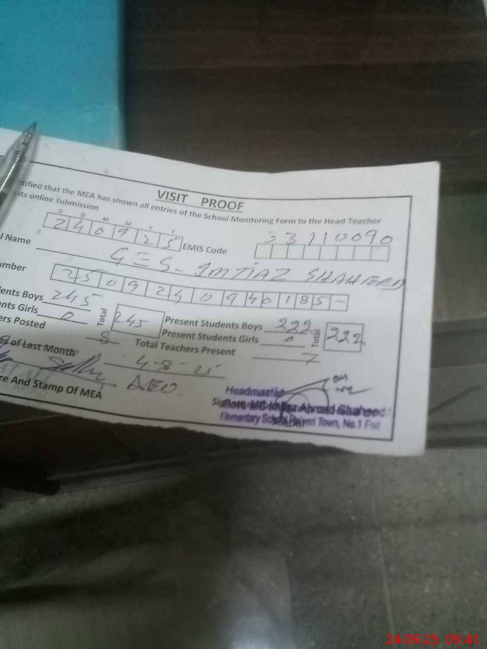 | Attendance Register | Head Teacher | MEA with School | Visit Proof |