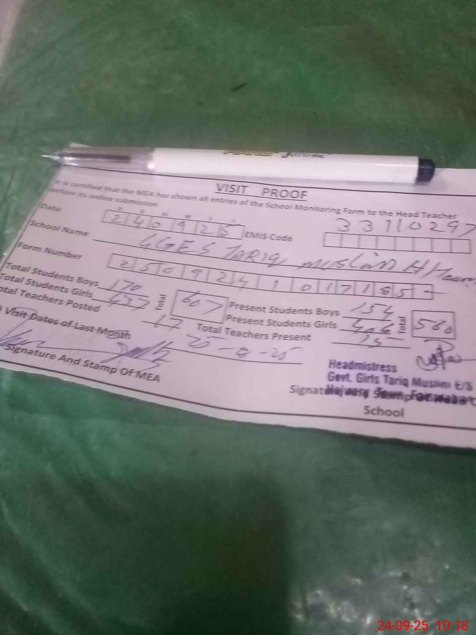 | Attendance Register | Head Teacher | MEA with School | Visit Proof |