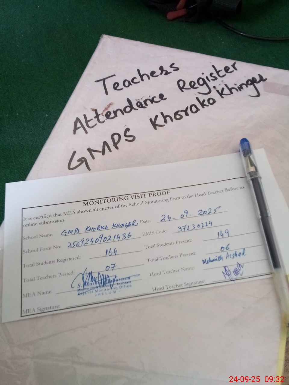 | Attendance Register | Head Teacher | MEA with School | Visit Proof |