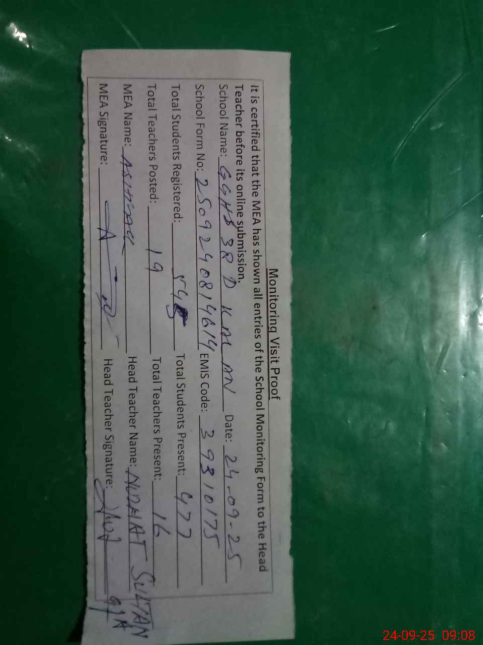 | Attendance Register | Head Teacher | MEA with School | Visit Proof |