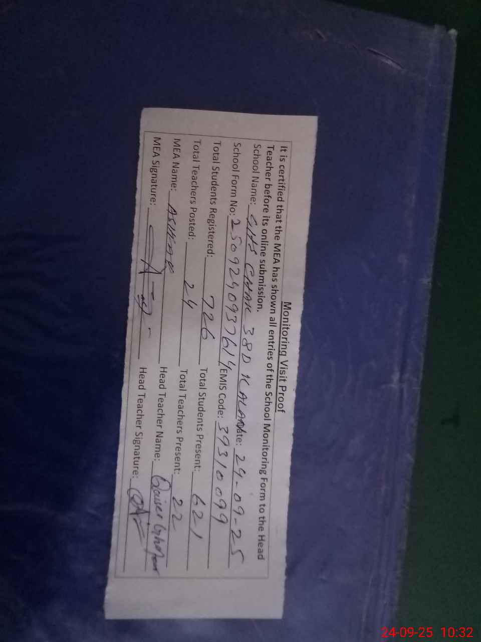 | Attendance Register | Head Teacher | MEA with School | Visit Proof |