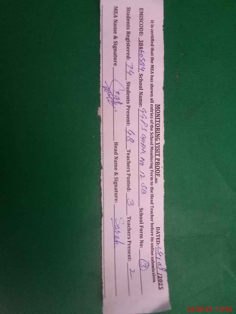 | EMIS Code: 38460584 | Name of School: GGPS CHAK NO.12 SB | |||