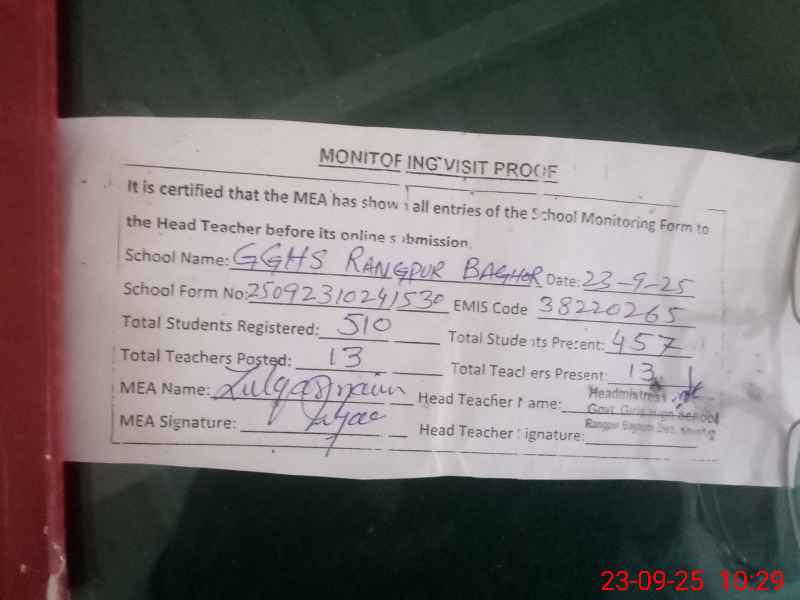| EMIS Code: 38220265 | Name of School: GGHS RANG PUR BAGHOOR | |||