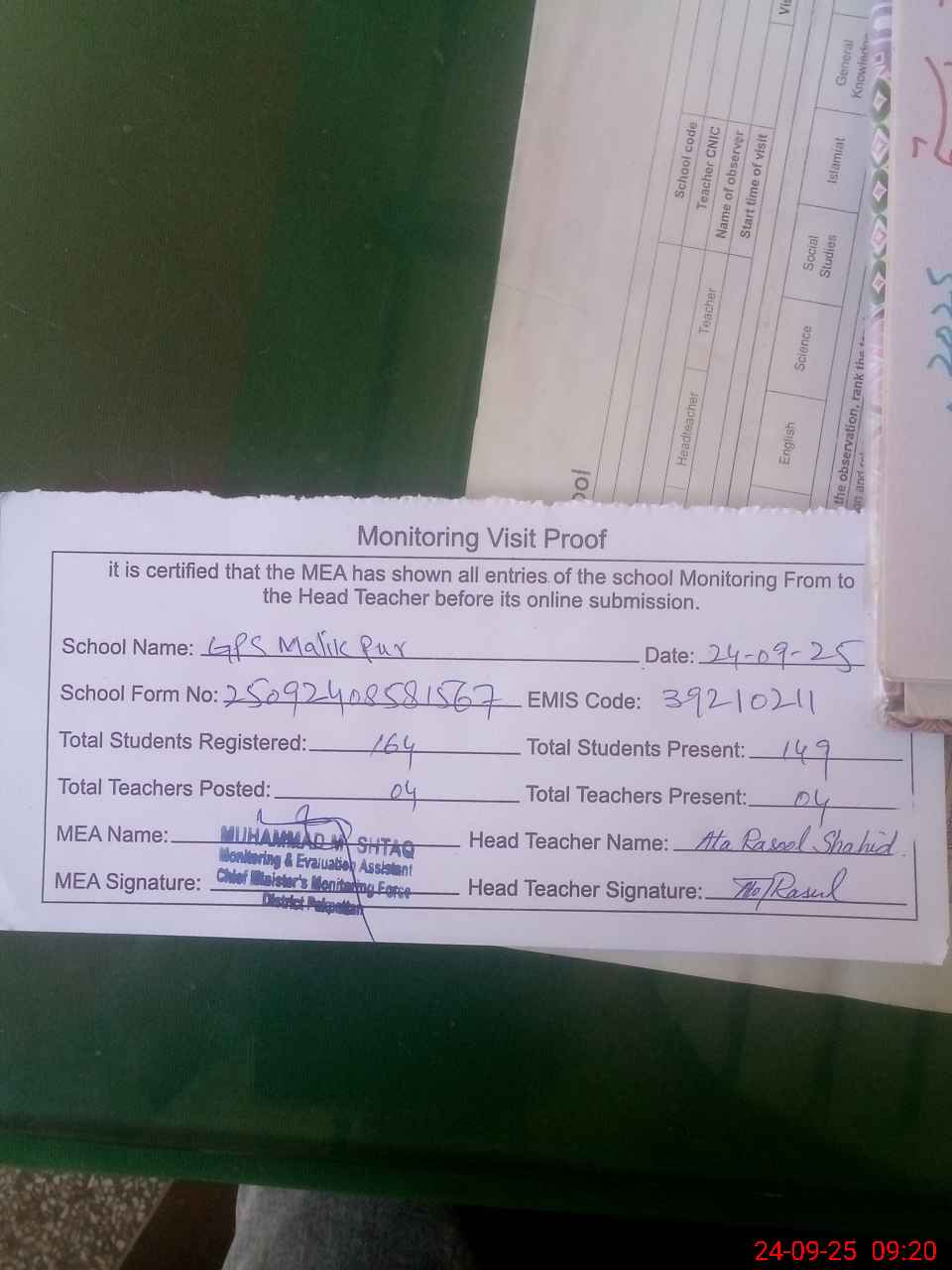 | Attendance Register | Head Teacher | MEA with School | Visit Proof |