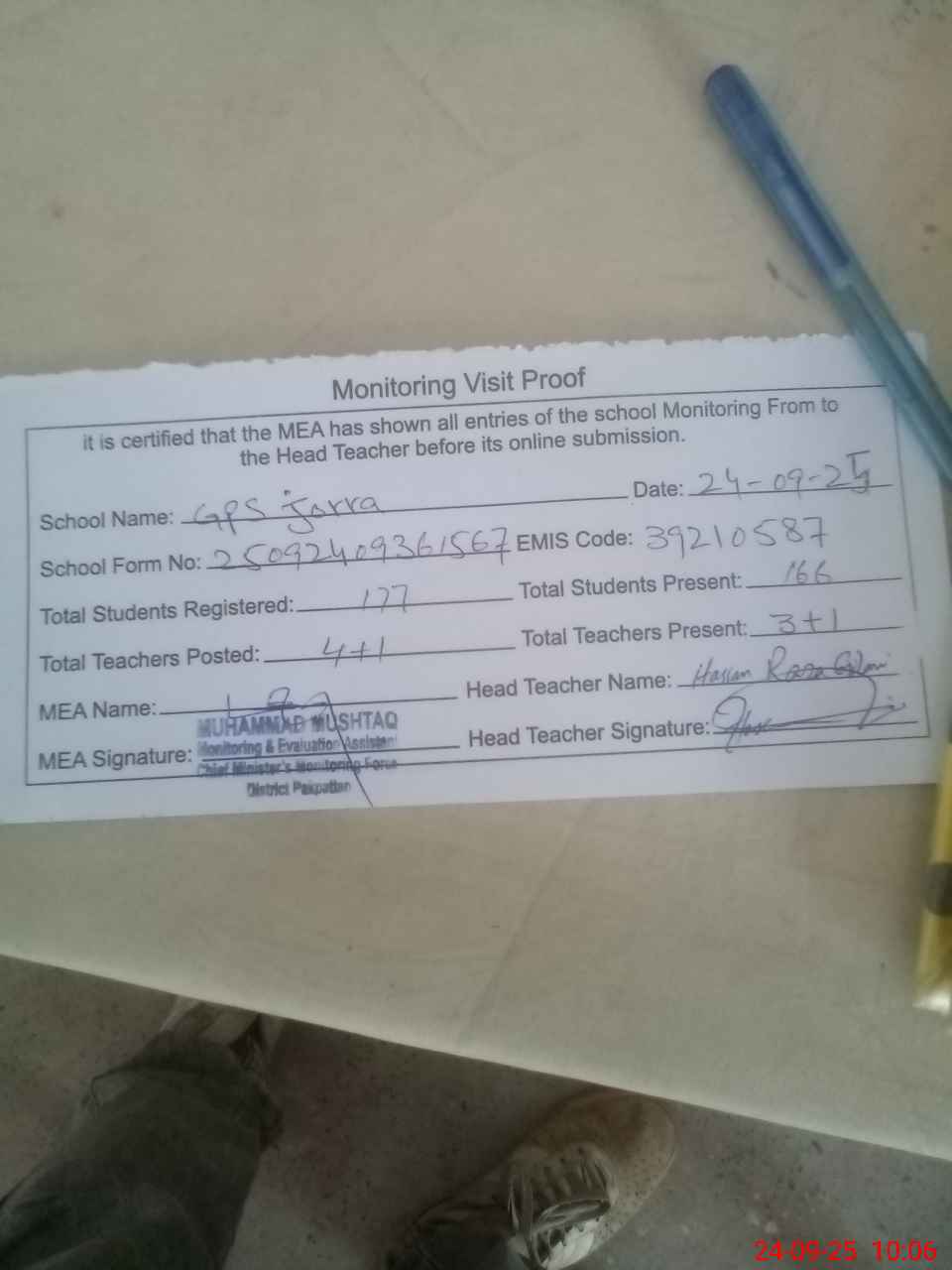 | Attendance Register | Head Teacher | MEA with School | Visit Proof |