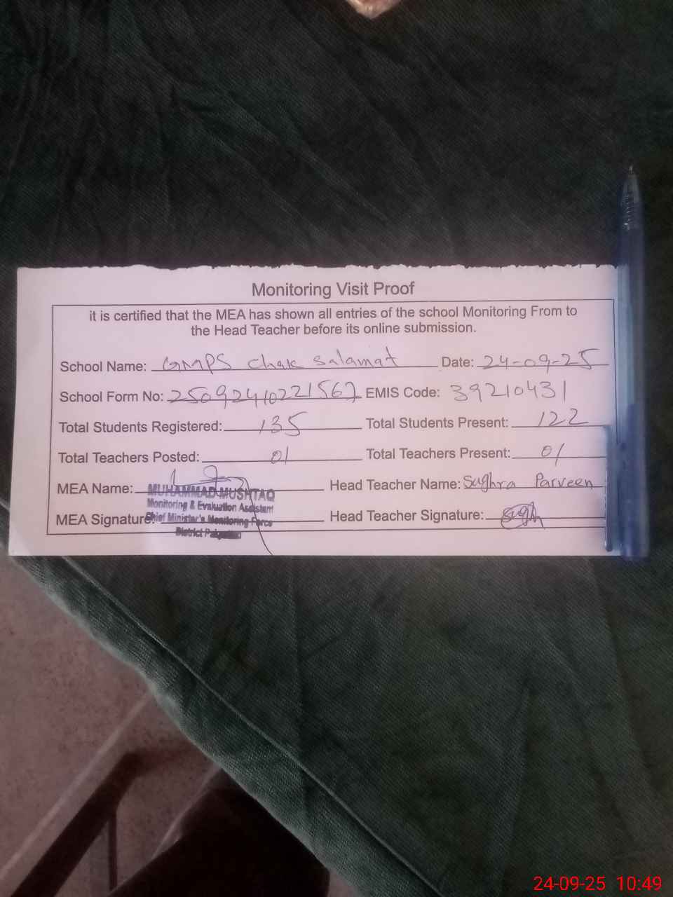 | EMIS Code: 39210431 | Name of School: GMPS CHAK SALAMAT | |||