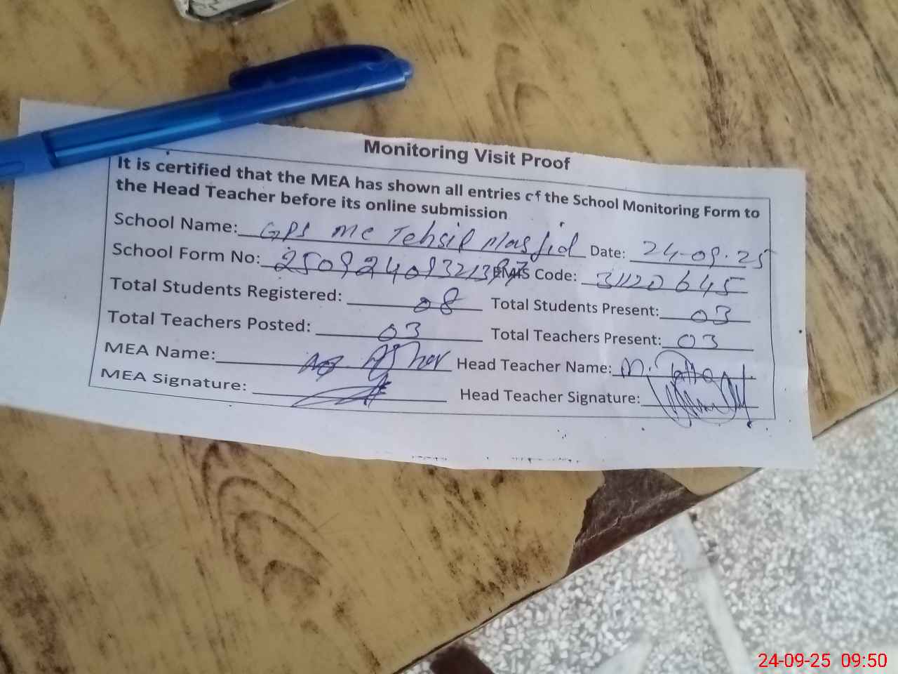 | Attendance Register | Head Teacher | MEA with School | Visit Proof |
