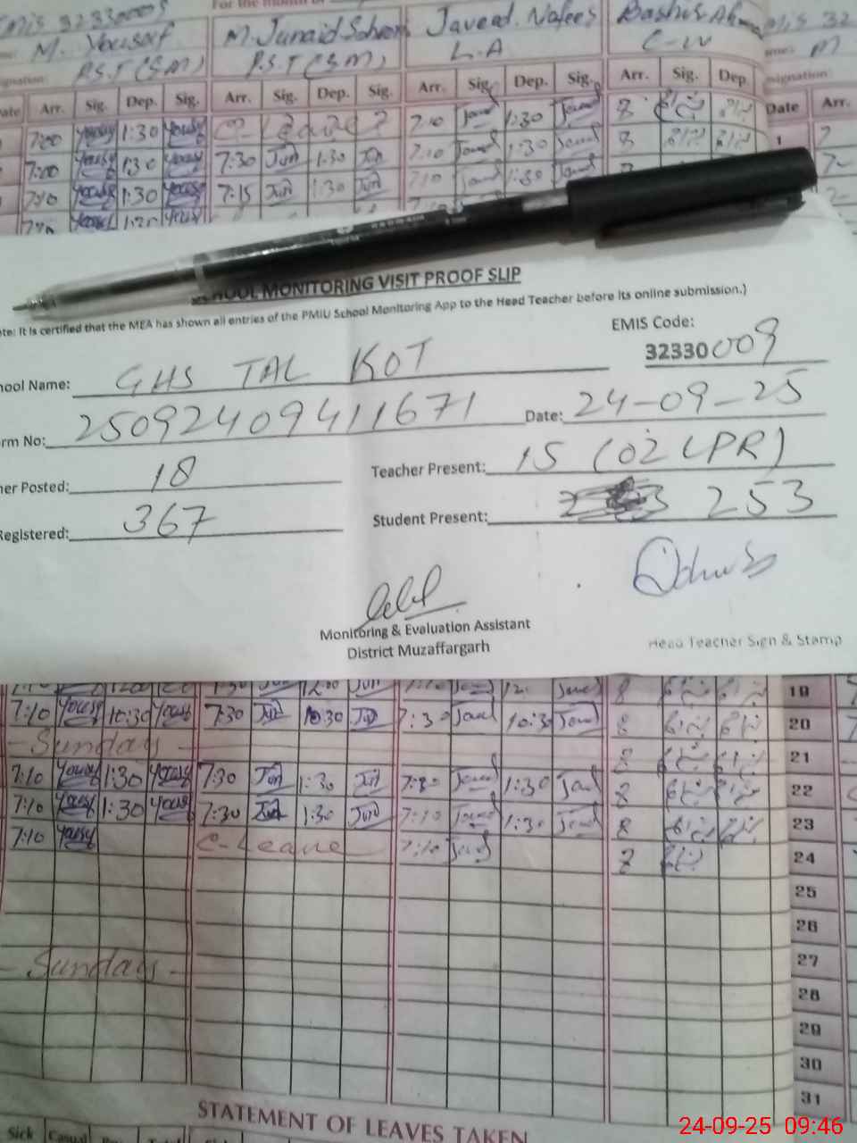 | Attendance Register | Head Teacher | MEA with School | Visit Proof |