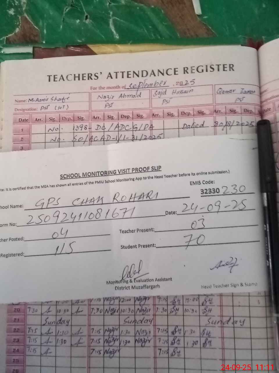 | Attendance Register | Head Teacher | MEA with School | Visit Proof |