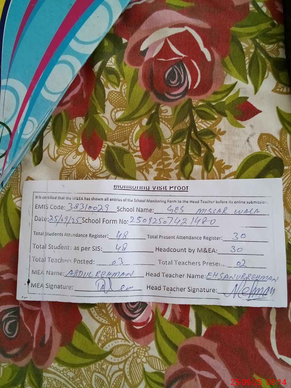 | Attendance Register | Head Teacher | MEA with School | Visit Proof |
