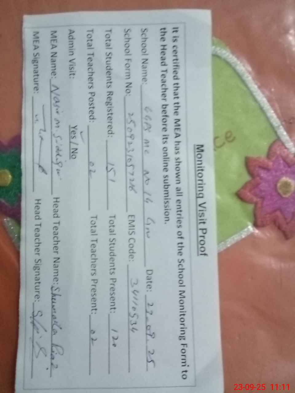 | Certified that this School was Inspected by the Undersigned MEA/DMO Today and the Information Stated Above is as Per Record. | |||||