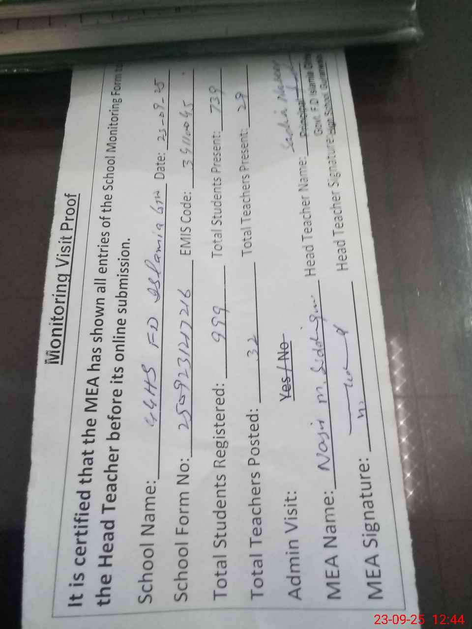 | Attendance Register | Head Teacher | MEA with School | Visit Proof |