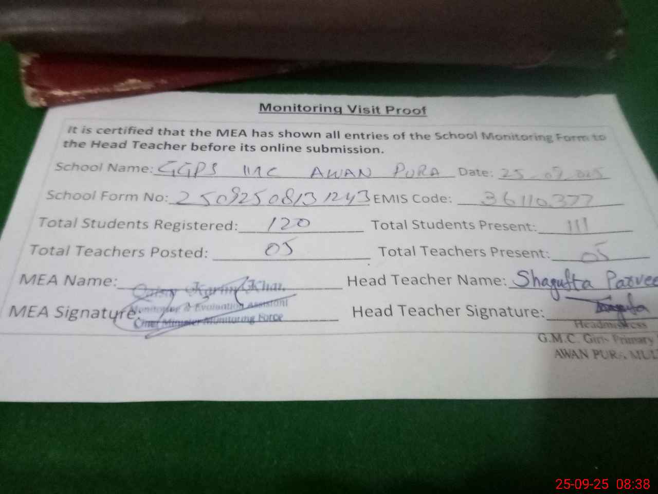 | Attendance Register | Head Teacher | MEA with School | Visit Proof |