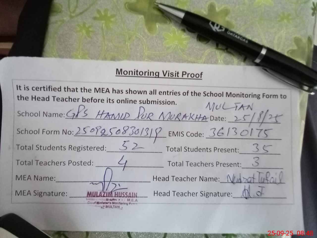 | Attendance Register | Head Teacher | MEA with School | Visit Proof |