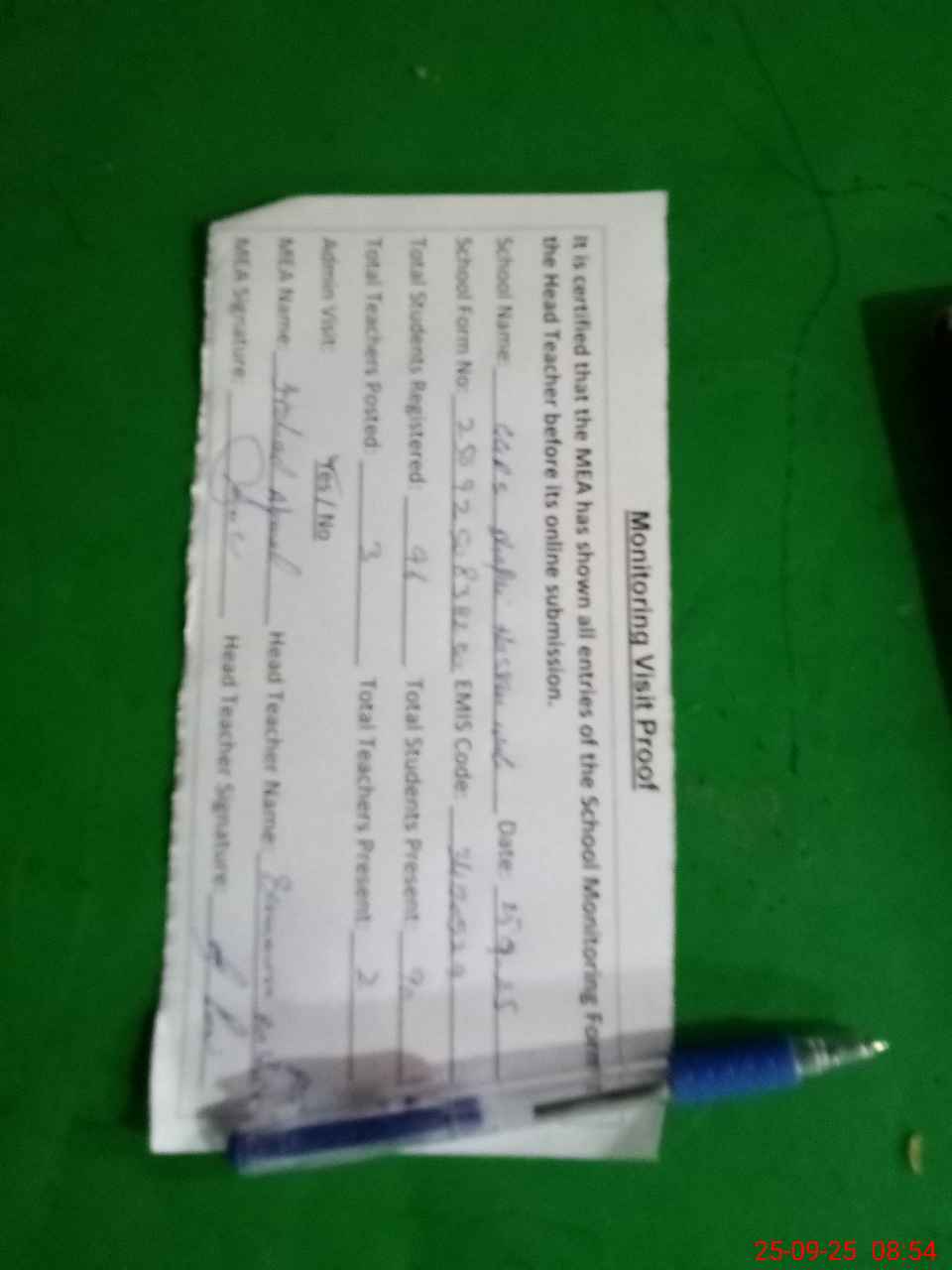 | Attendance Register | Head Teacher | MEA with School | Visit Proof |