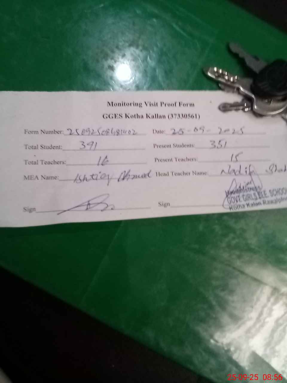 | Attendance Register | Head Teacher | MEA with School | Visit Proof |