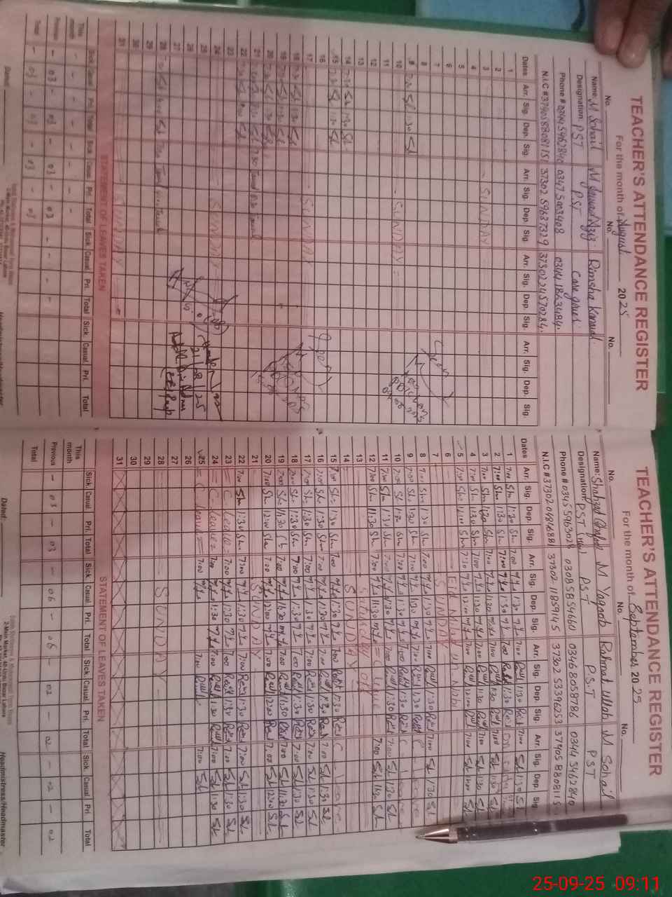 | CNIC | Full Name | Designation | R/C | Absence During Last Calender Month |