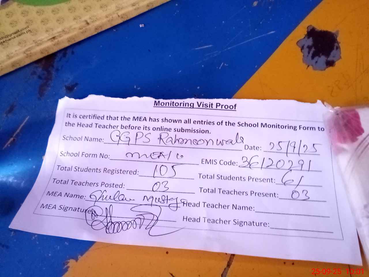 | Attendance Register | Head Teacher | MEA with School | Visit Proof |