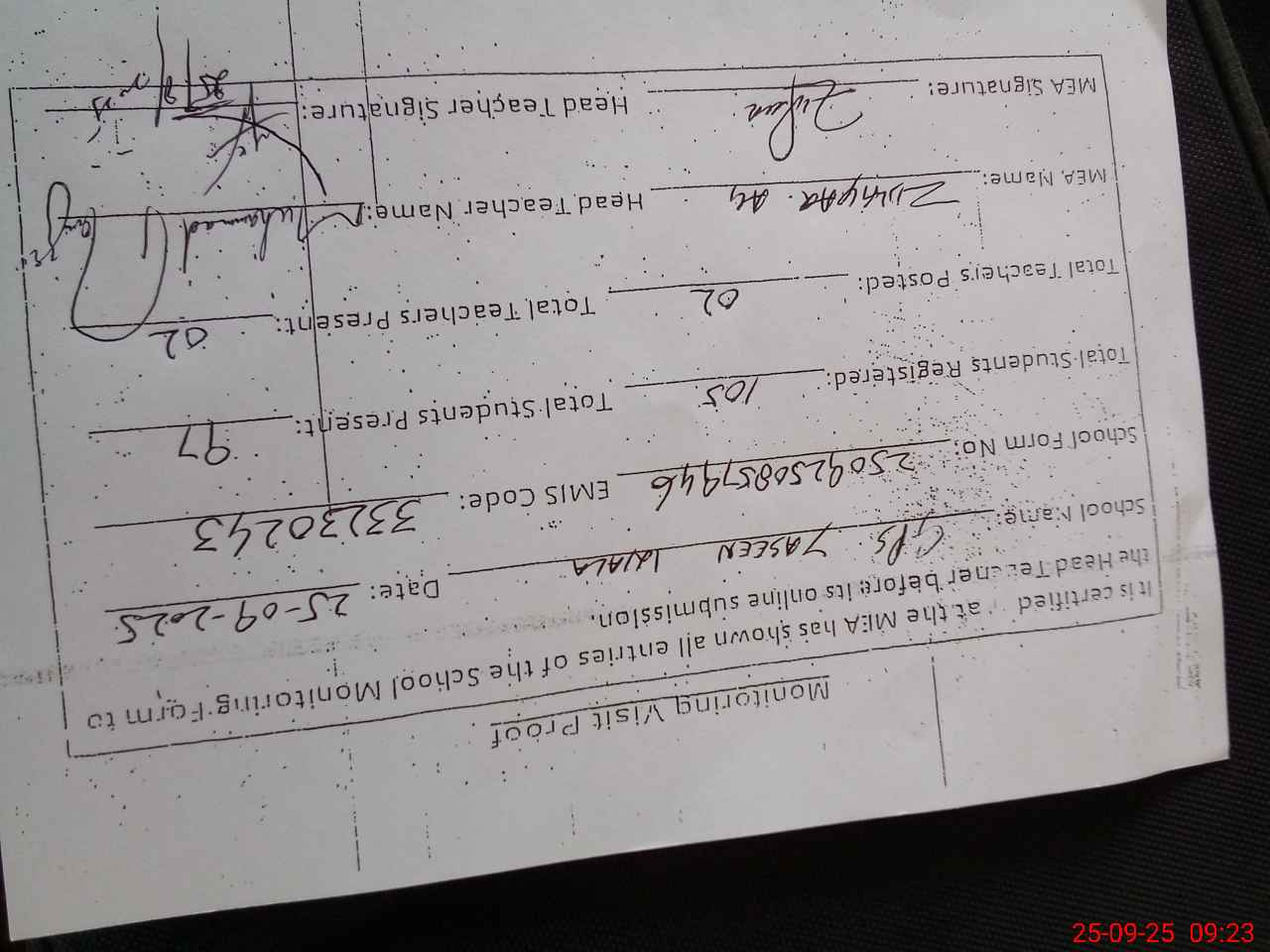| Attendance Register | Head Teacher | MEA with School | Visit Proof |