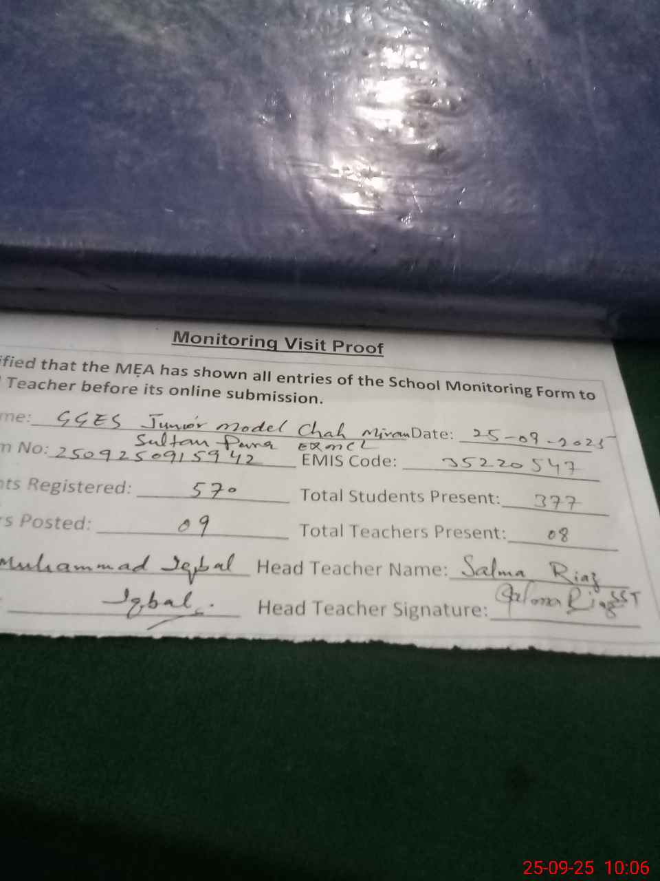 | Attendance Register | Head Teacher | MEA with School | Visit Proof |