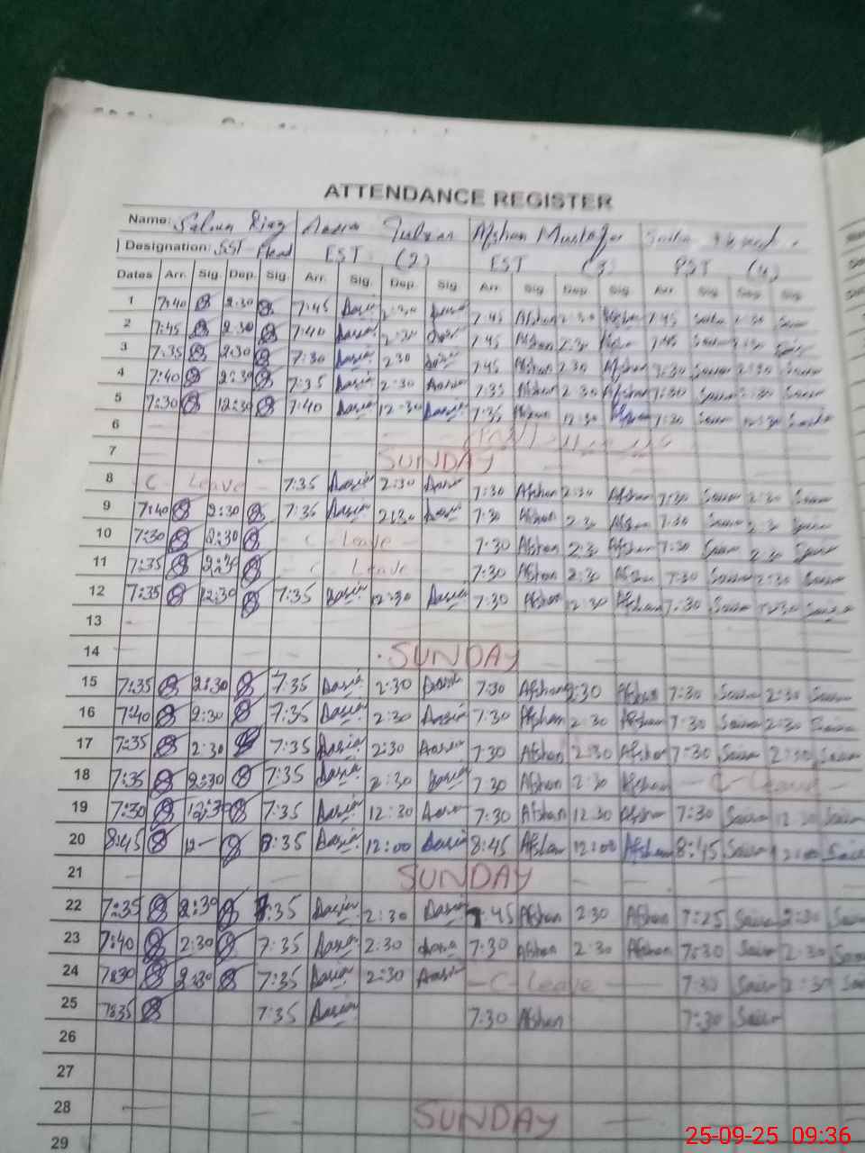 | CNIC | Full Name | Designation | R/C | Absence During Last Calender Month |