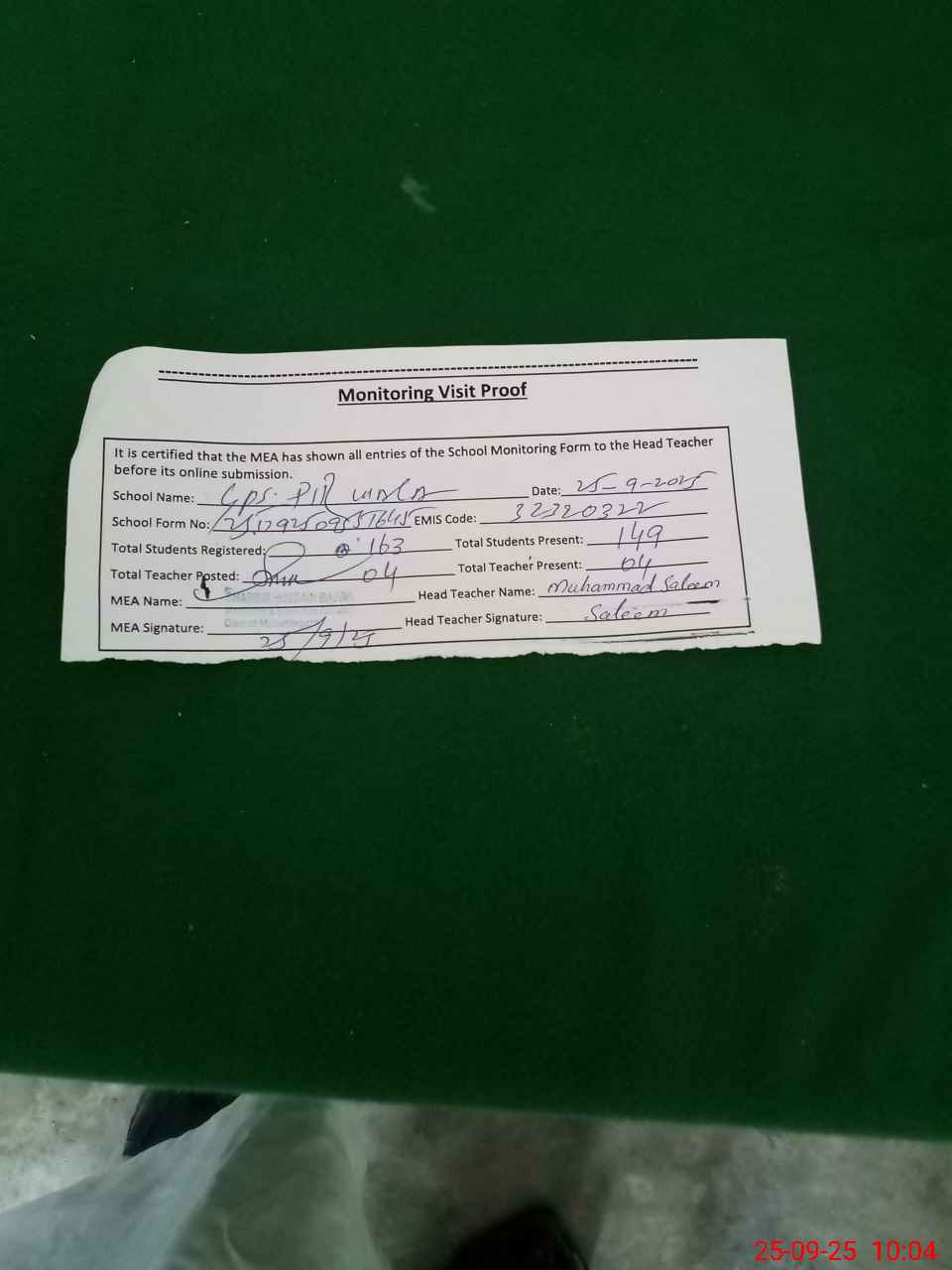 | Attendance Register | Head Teacher | MEA with School | Visit Proof |