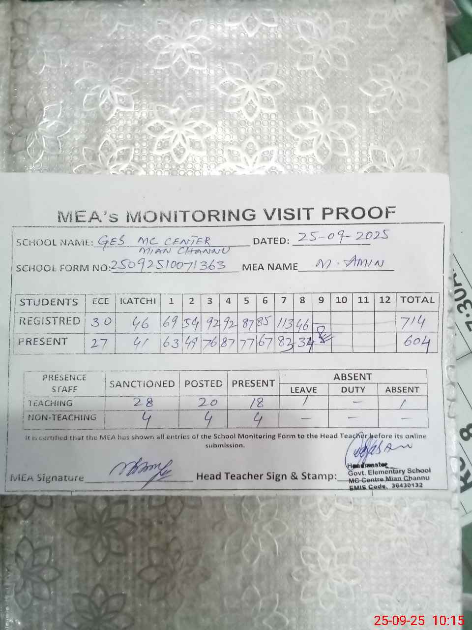 | Attendance Register | Head Teacher | MEA with School | Visit Proof |
