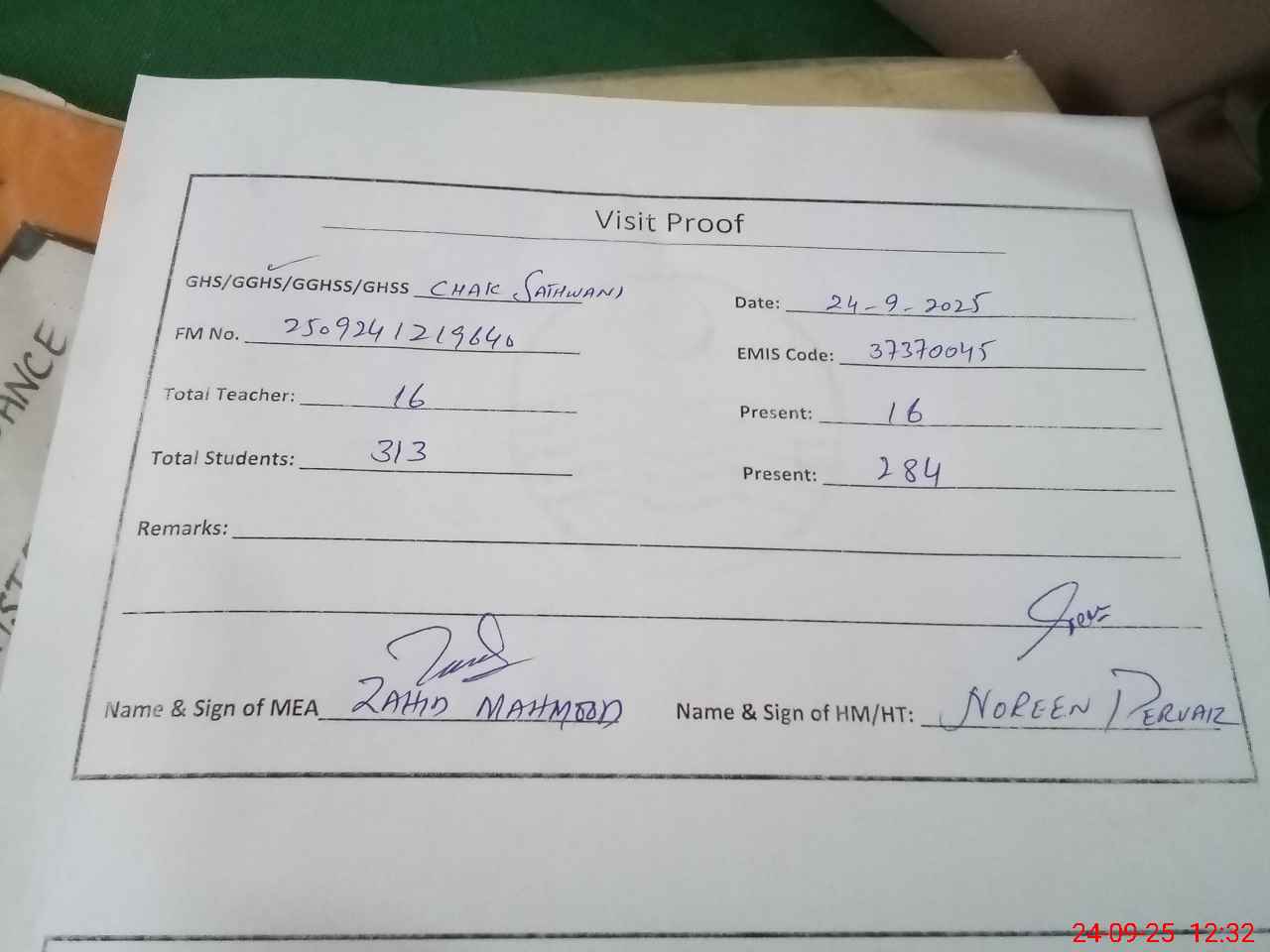 | Attendance Register | Head Teacher | MEA with School | Visit Proof |
