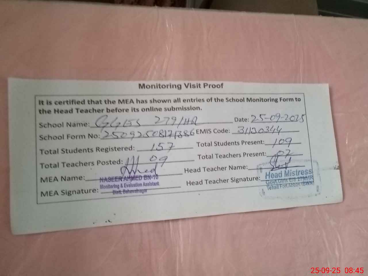 | Attendance Register | Head Teacher | MEA with School | Visit Proof |