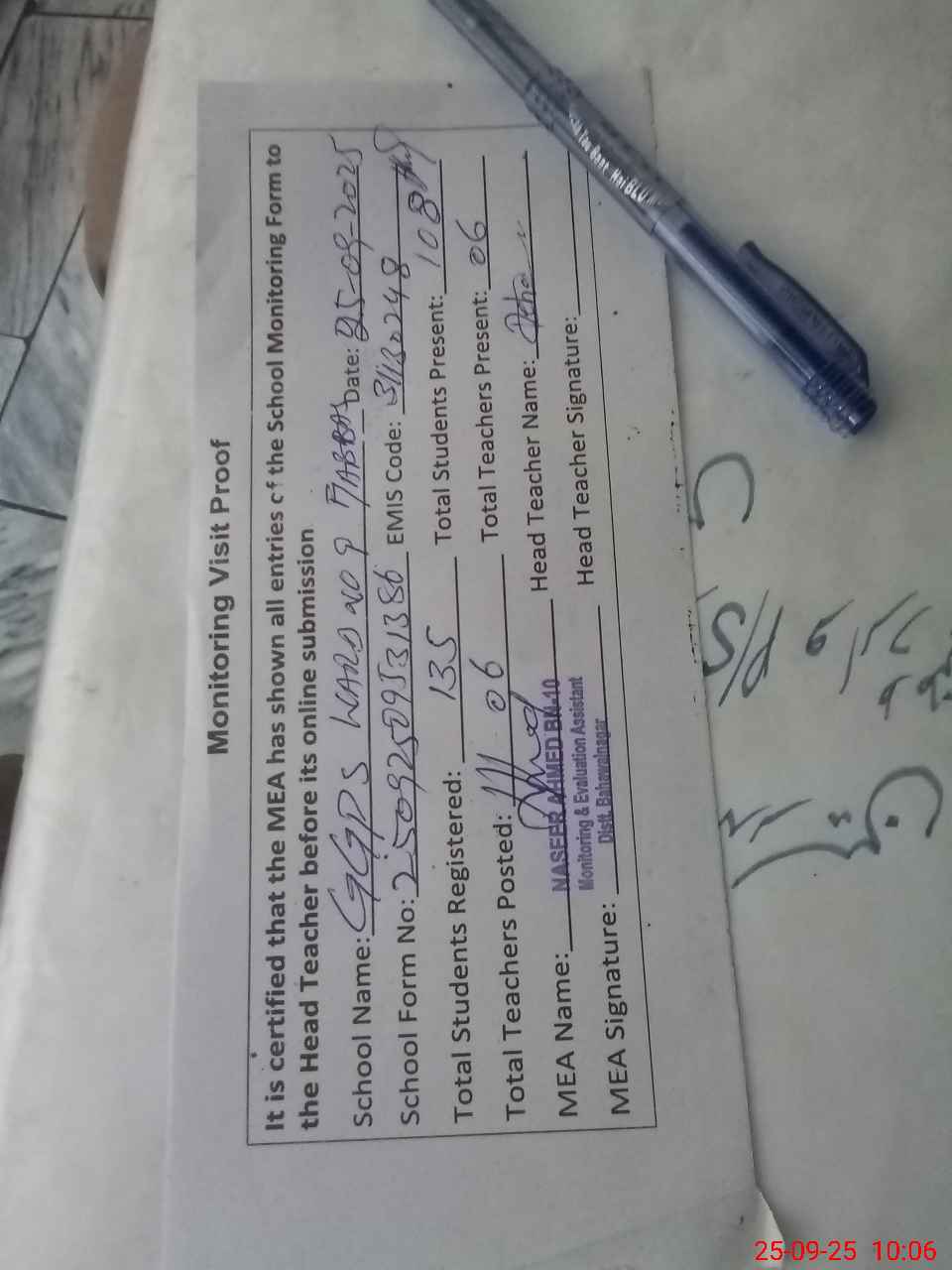 | Attendance Register | Head Teacher | MEA with School | Visit Proof |