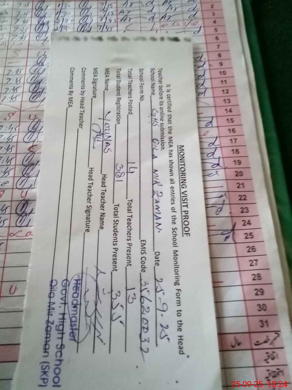| Attendance Register | Head Teacher | MEA with School | Visit Proof |