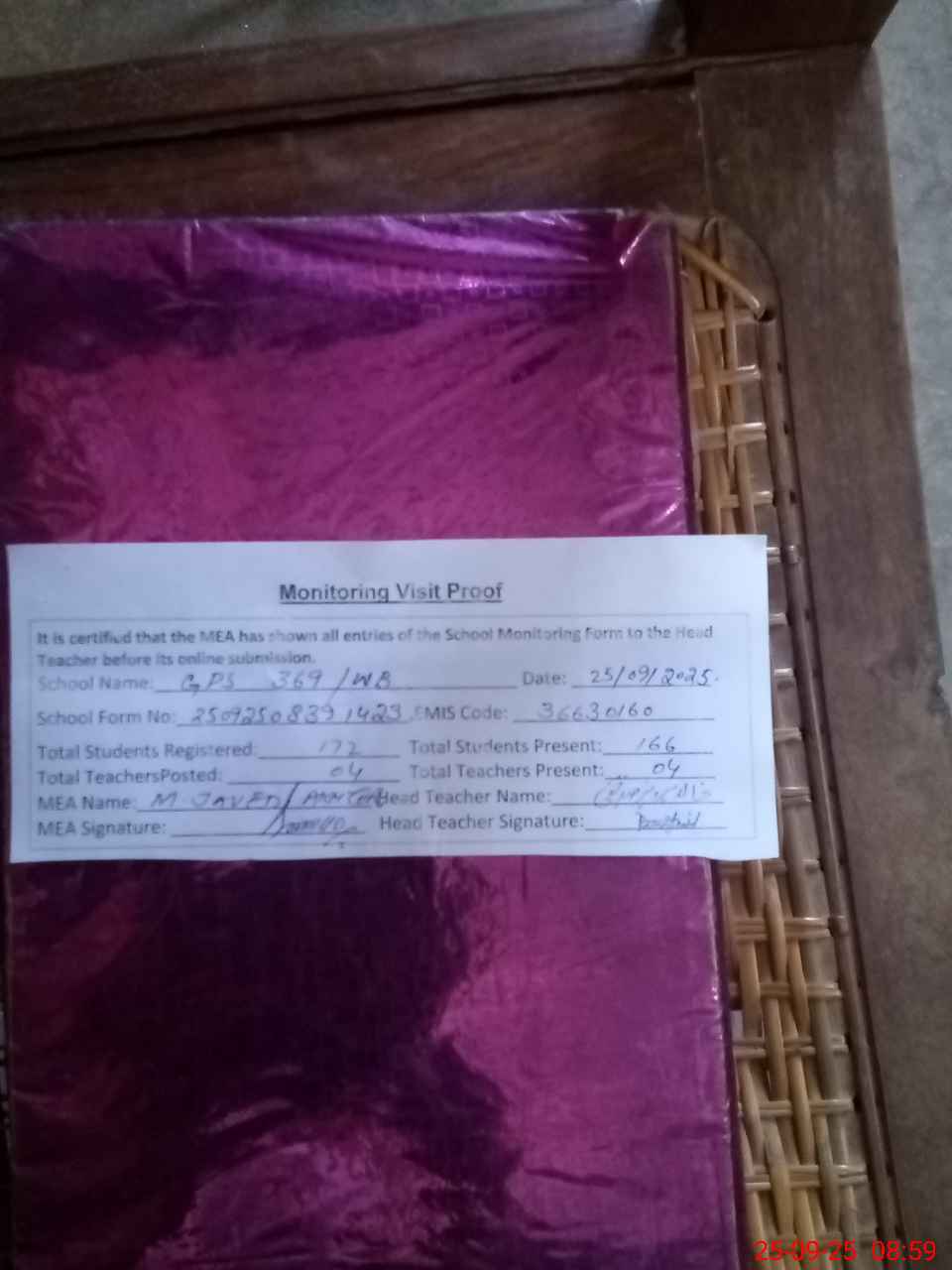 | Attendance Register | Head Teacher | MEA with School | Visit Proof |