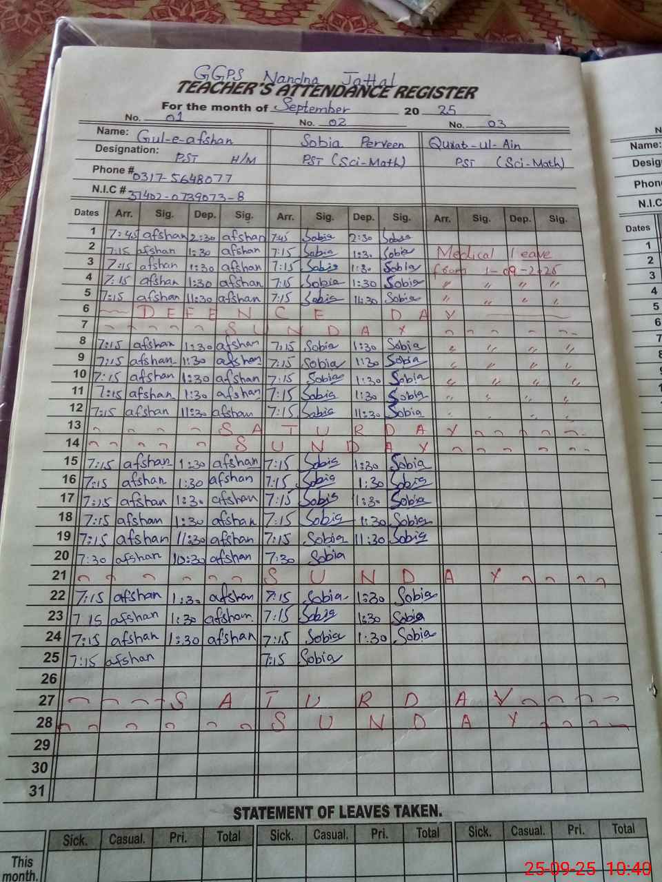 | CNIC | Full Name | Designation | R/C | Absence During Last Calender Month |