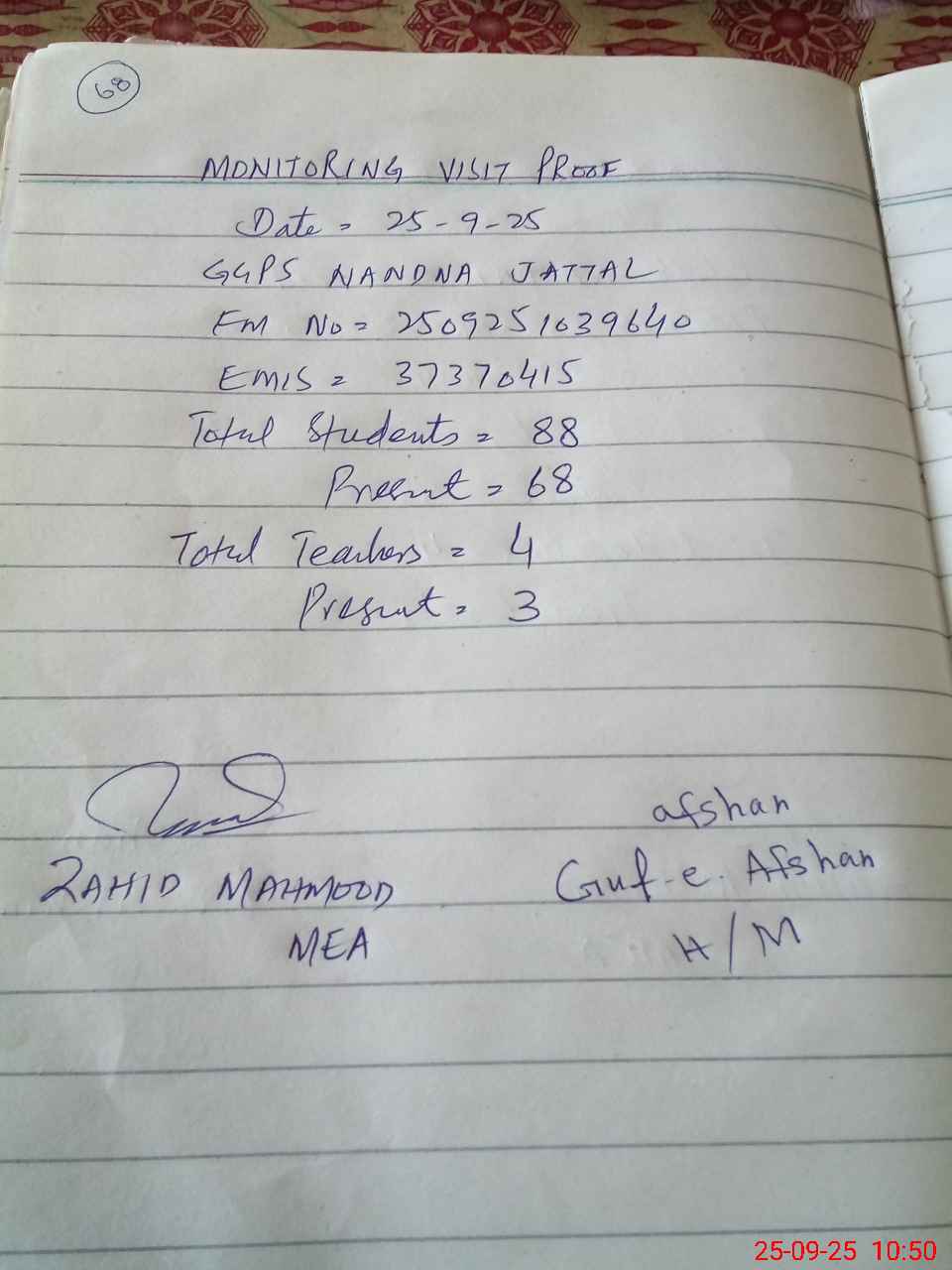 | Attendance Register | Head Teacher | MEA with School | Visit Proof |