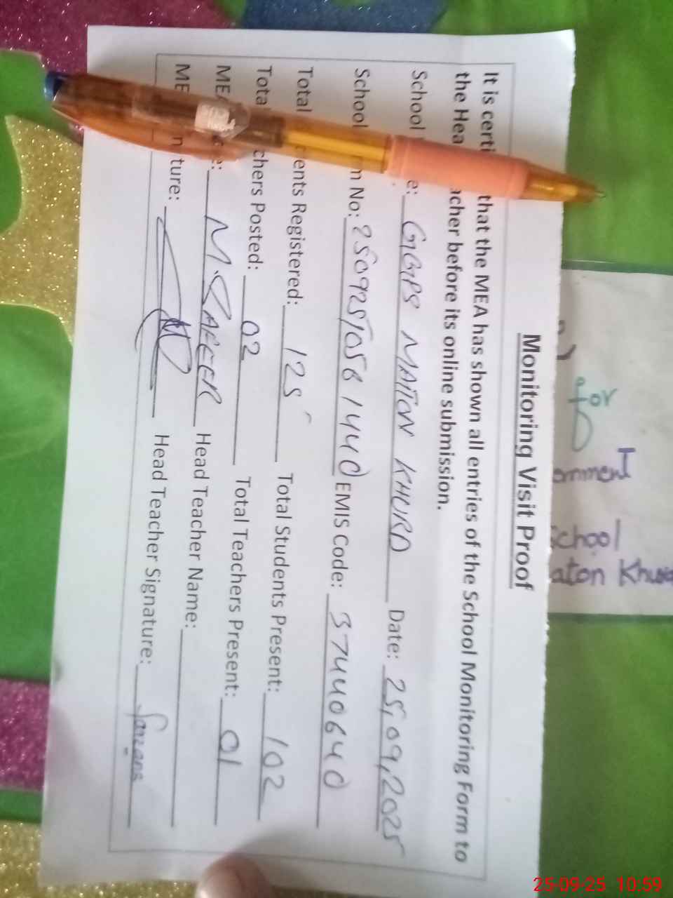| Attendance Register | Head Teacher | MEA with School | Visit Proof |