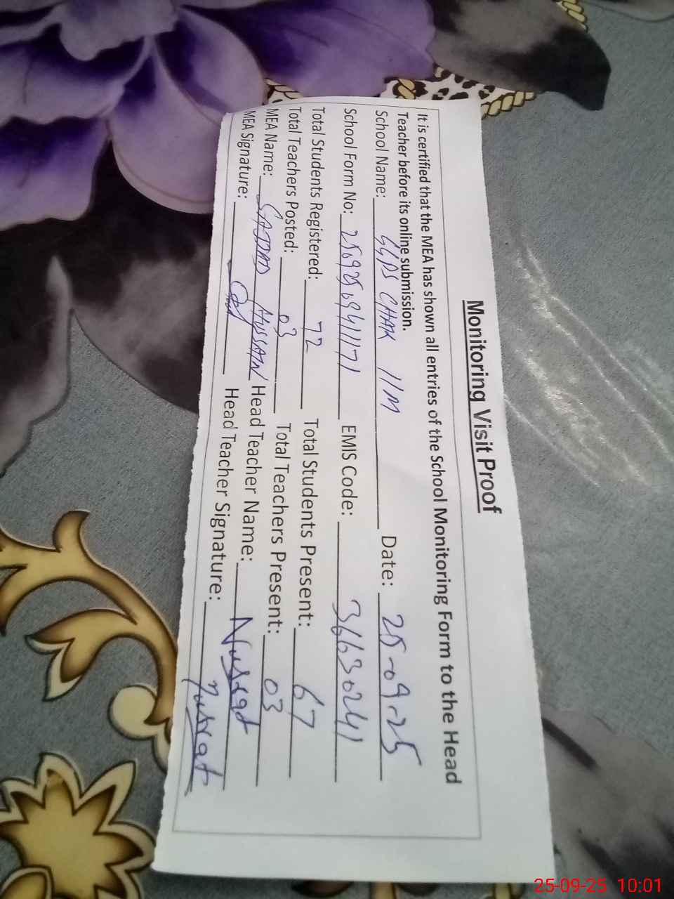 | Attendance Register | Head Teacher | MEA with School | Visit Proof |