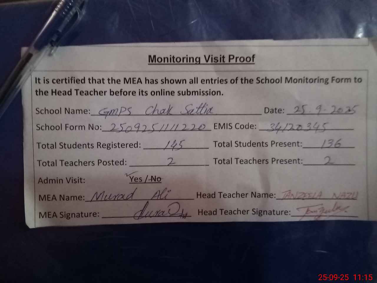 | Attendance Register | Head Teacher | MEA with School | Visit Proof |