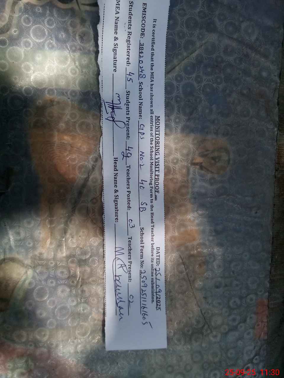 | Attendance Register | Head Teacher | MEA with School | Visit Proof |