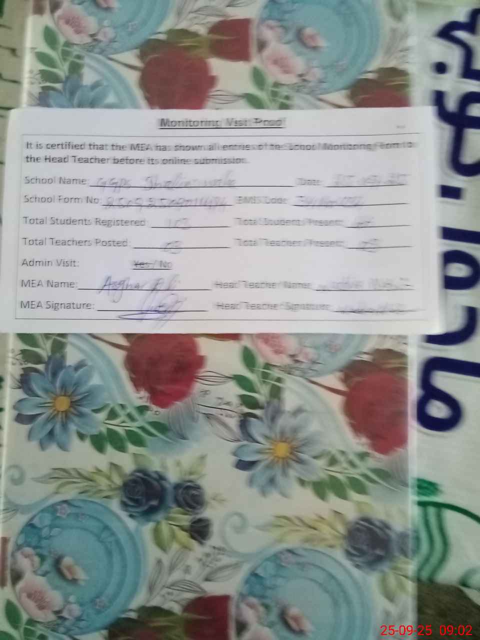 | Attendance Register | Head Teacher | MEA with School | Visit Proof |