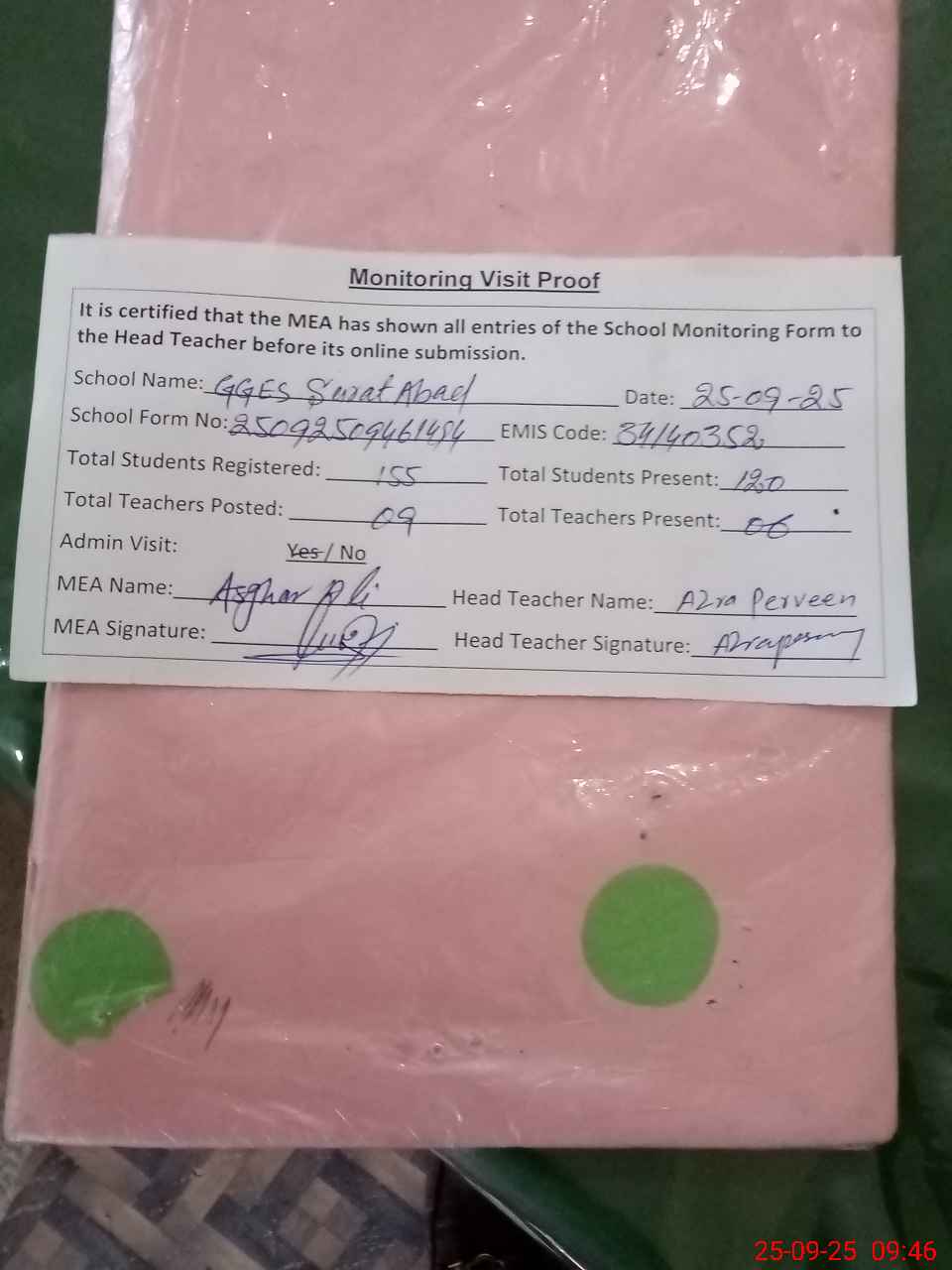 | Attendance Register | Head Teacher | MEA with School | Visit Proof |